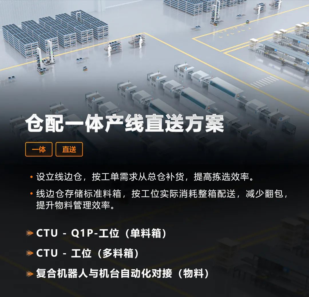 根据不同场景,直送产线工位的形式可分为三种方式:第一种是Q1P搬运单个料箱至工位;第二种是CTU一次搬运多个料箱至工位;第三种是复合机器人与机台设备实现自动化对接,实现物料配送。