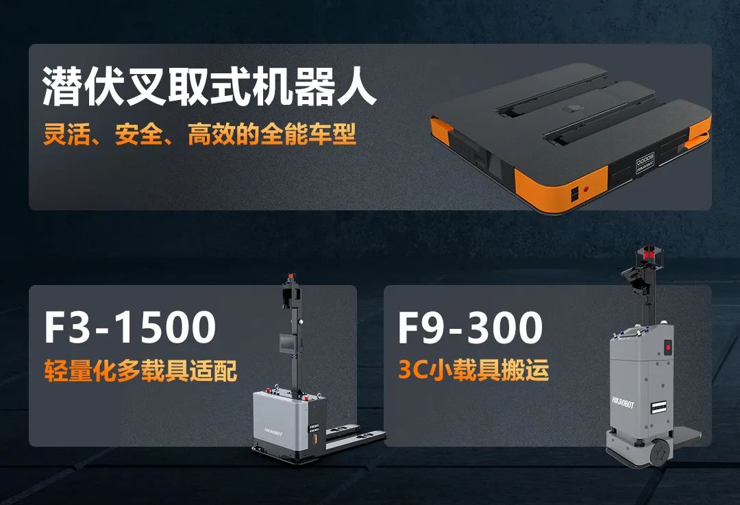 除了仓配一体产线直送方案之外,海康机器人为3C行业的更多业务环节带来更丰富的方案选择。针对原材料月台收货、成品出入库、包材大件物料配送等场景,海康机器人推出了适配3C行业的全新产品,包括支持选配差速和全向底盘且适应极窄通道作业的潜伏叉取机器人,以及轻量化智能车型 F3-1500和专为3C行业小载具搬运打造的F3-900两款叉取机器人产品。