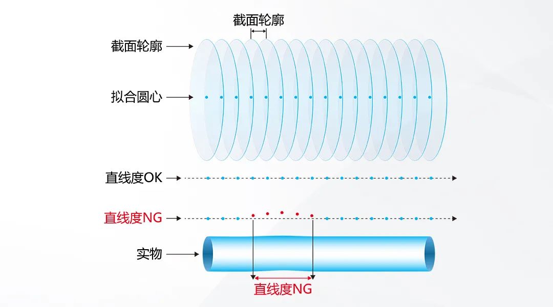通过对截面数据的分析,可以计算出不同截面位置的圆心点坐标,进而实时监控线缆/管材直线度,当圆心坐标跳动超出一定阈值时,则判定线缆/管材某位置处发生弯折。
