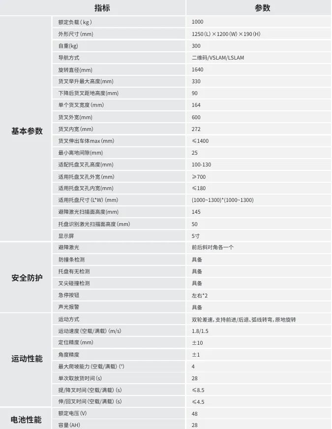 · 毫米级定位精度:AI动态识别货架,自适应对接,调整进入货架中心,支持货架腿识别进入,定位精度可以达到±10mm,角度精度±1° ,最小离地间隙25mm。