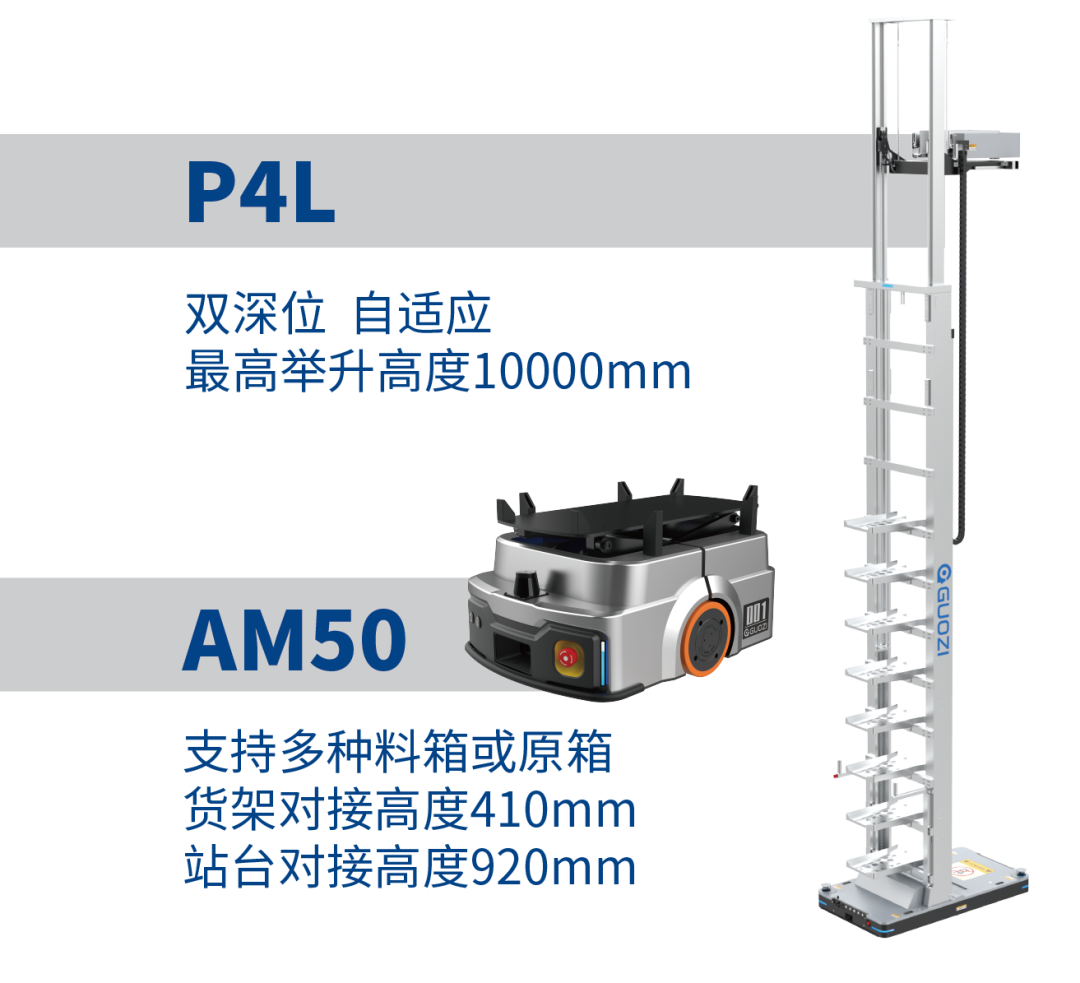 各司其职:P4L负责巷道内的料箱上下架,AM50负责把料箱送到站台拣选。