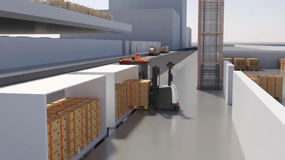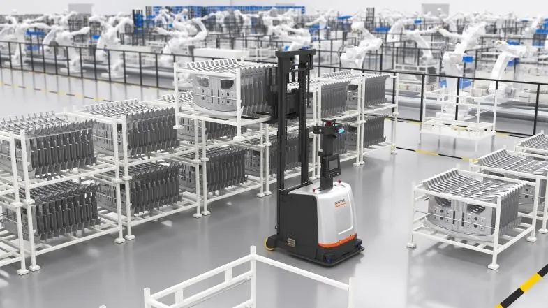 光伏行业仓库至车间的物料转运涉及跨车间室外运输,一般采用平衡重+牵引车接驳的方式实现。为了实现稳定精准接驳,该项目平衡重式叉取型AMR采用多激光融合技术自主识别寻找牵引平板车位置,自主计算最合适的放货位置,精准放置,保证运行的安全稳定。