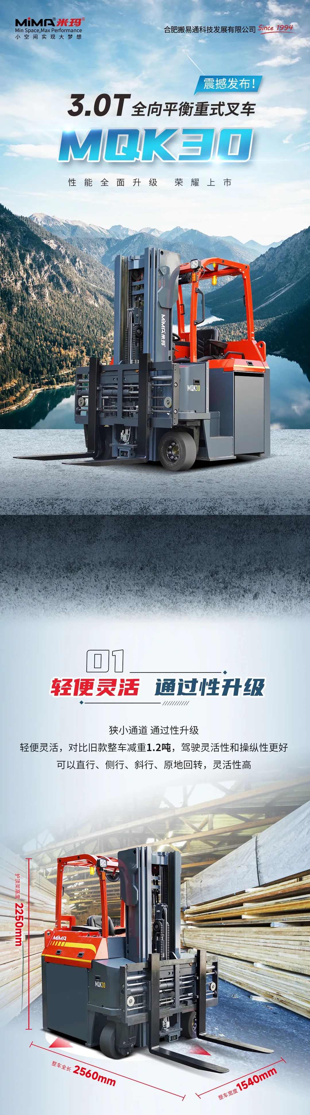 二十多年不断进取, MIMA 品牌以公司强大的科研创新团队为依托,以“安全、耐用、舒适、低碳(环保)”为设计理念,为客户提供500KG —100000KG应用解决方案、仓储设备及 相关服务。 通过不断的技术创新和专利积累,现在我们的产品已涉及12大类50多个品种,如电动托盘车搬运车、托盘堆垛车、前移式叉车、平衡重式叉车、牵引拖车、拣选车、窄巷道叉车、四向叉车、侧面叉车和非常物流设备、AGV、无人巷道堆垛机等等。产品广泛 应用于医药、食品、化工、电子、机械、家具、物流等各个行业。