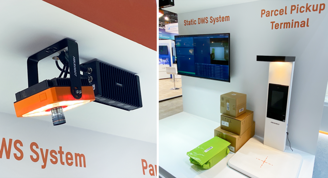 该区域展示了海康机器人静态DWS方案:在物流信息收集过程中无需人工干预,可以自动收集基础数据,适用于多种类型(如黑色、高反光、薄片、异形件等)包裹的体积测量。