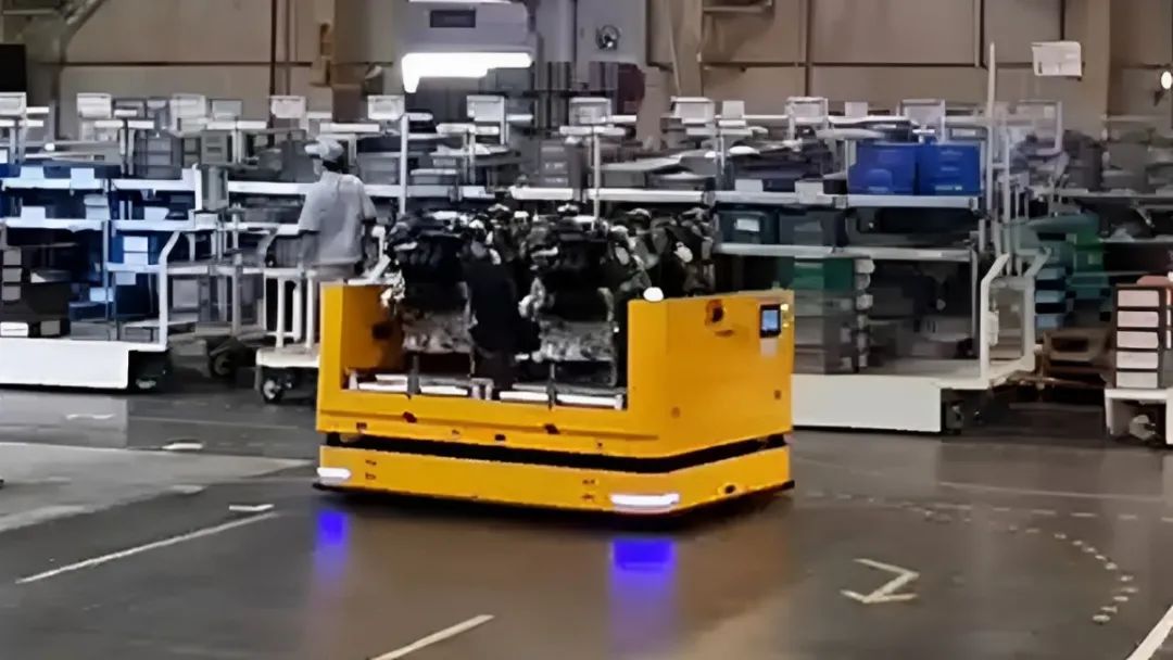 某华南汽车制造企业,车间环境空旷,周边摆满周转料车,且人车混流,厂房内零部件堆放变化大,属于典型的高动态环境,传统2D激光雷达定位十分困难。为满足该场景需求,采用迈尔微视SLAM导航定位方案,将传感器安装于大型辊筒搬运AMR上端,负责运输发动机部件,提高机器人定位的稳定性。