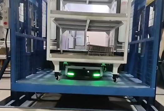系统首先引入了定制化的货架设计,确保喷砂产品能够稳固放置并通过固定装置锁紧。操作人员只需简单操作,即可将产品安全放置于货架之上。随后,通过一键召唤功能,空闲的转运机器人迅速响应,自动定位至装载区,准备执行转运任务。