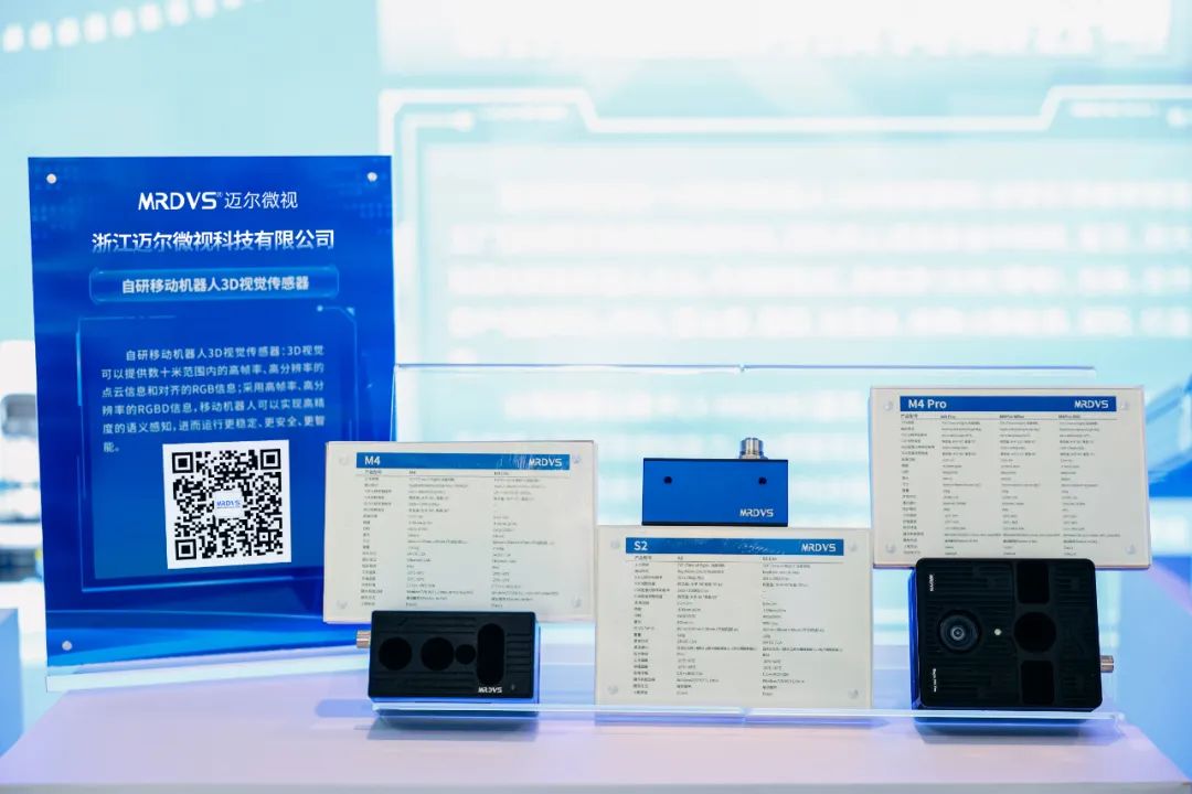 迈尔微视携S(视觉避障)、M(视觉对接)、V(视觉导航)、H(视觉抓取)四大系列产品参加了“余杭区科技成果展”。其中,S系列专为满足移动机器人应对复杂环境下的避障需求而设计,可实时检测悬空和低矮障碍物,内置领先的语义识别算法,可输出更丰富的障碍物信息。M系列专为满足移动机器人对托盘或料笼的对接、堆叠等需求而设计,可提高无人叉车对接托盘、料笼的精度。V系列专为满足移动机器人的定位导航需求而设计,可自动扫描室内顶部环境生成稠密点云地图,从而实现机器人无标记自然导航,并且获得优于2D激光雷达的稳定定位。H系列专为满足机器人的高精度抓取需求而设计,是高精度双目RGB-D与深度多模态相机,识别精度达±0.1mm@350mm,自带算力6 Tops,可实现目标物体的高精度定位,从而实现精准抓取。