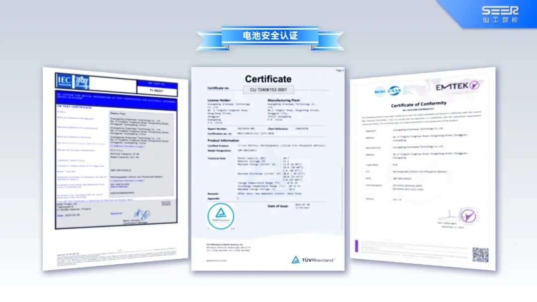 仙工智能模块电池已获得多项国际通用的电池安全认证,包括 CB、UL、CE 认证,确保了该产品在不同市场和应用环境中均符合严格的电气安全标准。