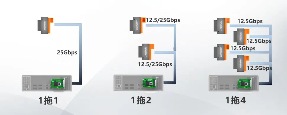 海康机器人具备不同CXP接口数量的配套采集卡,可支持1拖1、1拖2、1拖4等多种连接方式。客户可根据对行频及整套方案的架设需求灵活选择拓扑连接模式,性价比高。