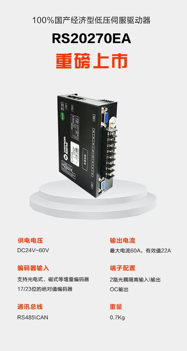 RS20270EA核心部件自主研发,采用100%国产零部件,功耗低,性能卓越,可对永磁同步低压伺服电机的位置、速度和转矩进行精确控制,可广泛应用于服务机器人、清洁机器人、配送机器人、物流行业AGV、AMR、无人叉车等移动设备领域。