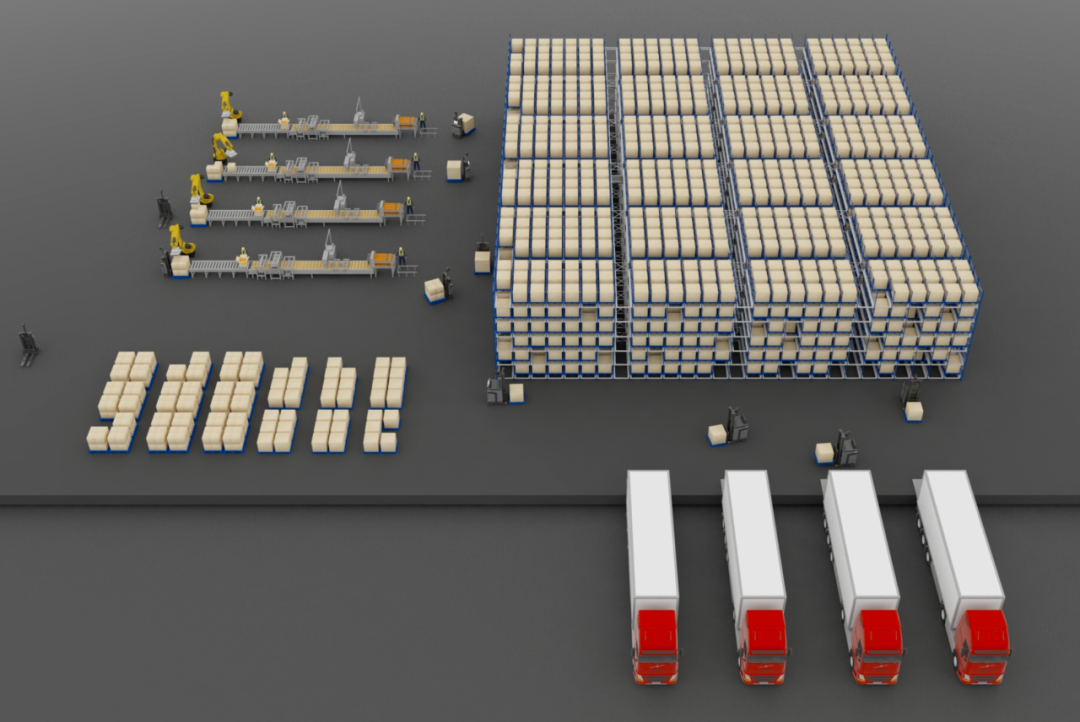 高效协同:无人叉车负责执行库外立体货架的搬运、堆垛任务,而四向穿梭车则专注于库内的存取作业。两者通过高效的协同作业,能够显著减少货物搬运和存储的时间,提升物流效率,提高系统柔性。