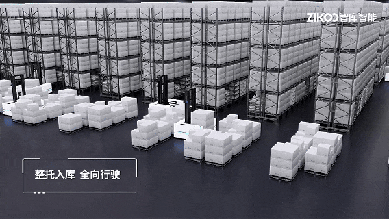 在传统堆高存储的仓库中,智库智能全球首推的全向堆高机器人U-bot,能够精准地在0-8m高度范围内取放货物,最大可承载1吨货物,穿梭在极窄巷道2100mm之中,成为取代人工叉车的“大力士”。