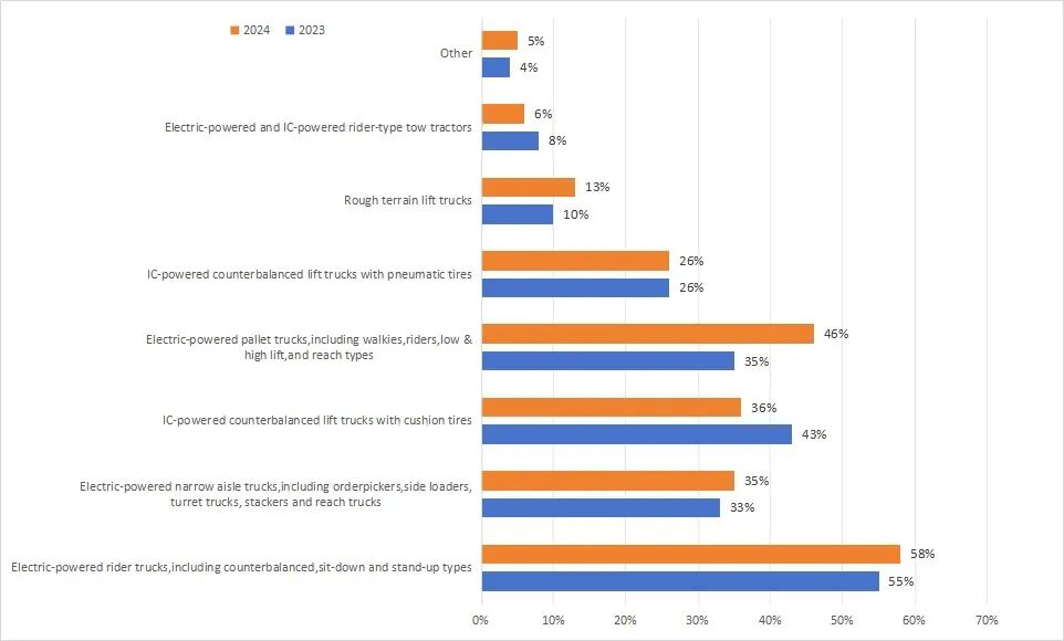 同时,随着传统叉车的应用面对多样化场景挑战,一股创新技术的浪潮正悄然兴起。其中,窄巷道托盘搬运机器人以其独特优势,正逐步成为解决这一难题的新锐力量。报告显示:35%的受访者正使用电动窄巷道叉车,对比往年数据有所提升,窄巷道搬运逐渐热门。