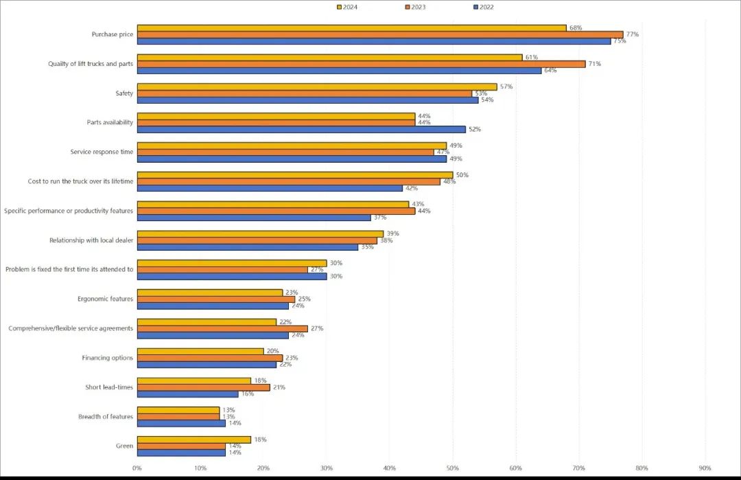 步入2024年,Peerless研究集团针对各类叉车使用情况的最新调查报告揭示了买家决策的新动向:在选购时,企业首先考虑的是购买或租赁的价格,但将价格放在首位的受访者人数降至 68%(2023 年为 77%)。在价格因素之外,设备的功能和服务已然成为影响购买决策的关键考量。