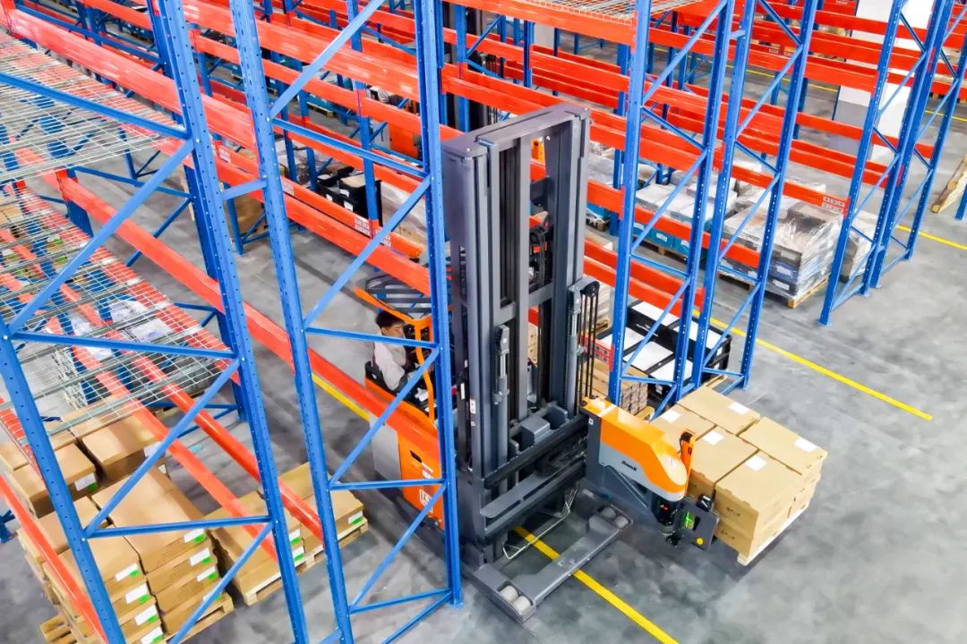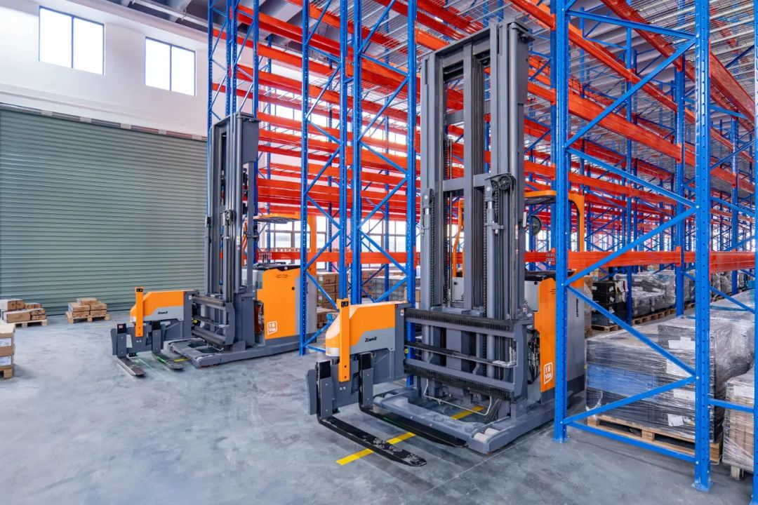 近日,卓一智能叉车两台人下行三向叉车落地新能源汽配行业客户现场。