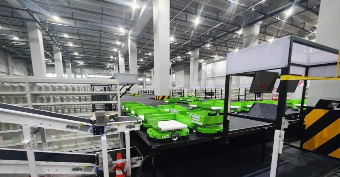 为了应对以上挑战,立镖为OliveYoung量身定制了一套高效的自动化分拣系统。320台立镖“小黄人”被引入OliveYoung的物流中心,变身“绿巨人”,形成了一套庞大且高效的自动化分拣网络。