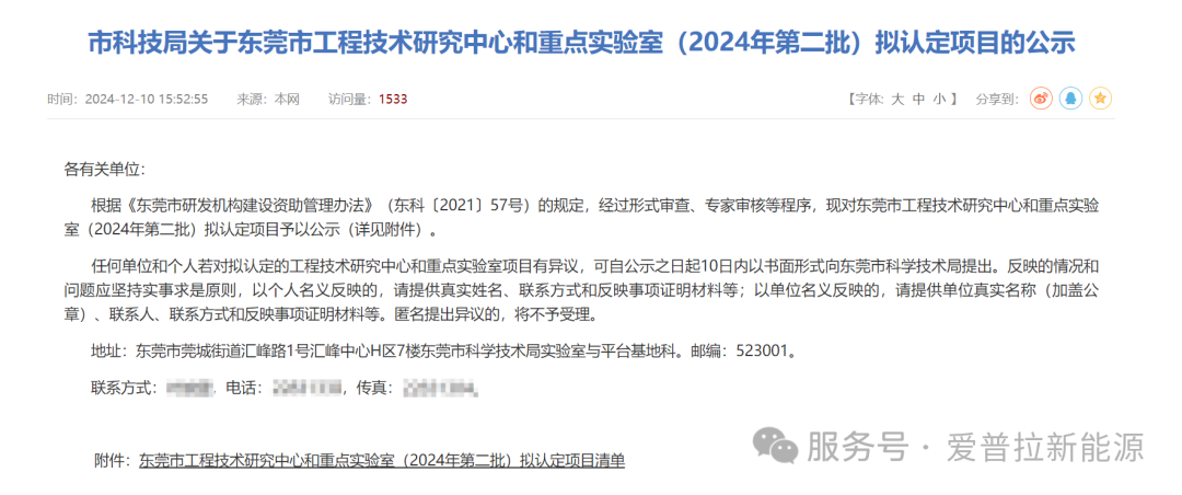 12 月 10 日,东莞市科学技术局发布了《东莞市工程技术研究中心和重点实验室(2024 年度第二批)拟认定项目公示》。我司广东爱普拉新能源技术股份有限公司,凭借在锂电充电设备工程技术领域的精耕细作与杰出创新,所申报的“东莞市锂电充电设备工程技术研究中心”成功通过认定。这一殊荣,意味着我司在充电设备领域再次迈出了坚实有力的一步。