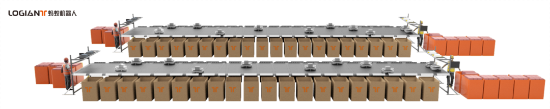 该项目占地300平米,共设置了两层平台,上下各部署40台,共计80台飞拣机器人,以及130个分拣格口,操作人员将物流包裹放置上件口,设备自动扫描包裹信息并与订单匹配,确定目标分拣口,自动规划路径,飞拣机器人快速投放。