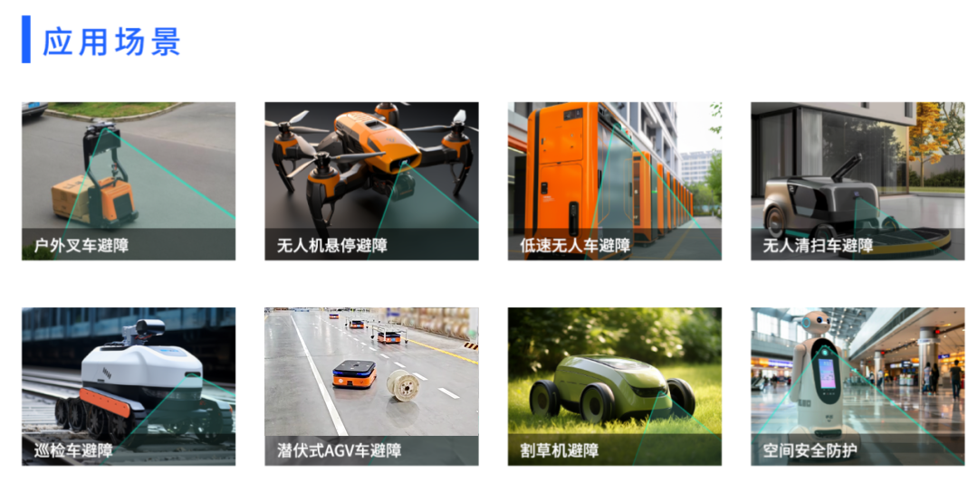 S10 Pro与S10具备240 × 160的深度分辨率,通过实时捕获深度与纹理信息,为低速无人车、无人叉车、无人机、割草机等设备提供稳定的远距离感知需求,可适用于室内外环境下的多种工作场景,包括避障、工程机械末端识别、桩孔测量、智慧交通、仓储物流和安防应用等场景。S10 Pro可支持到18米探测距离,适合远距离感知需求,而S10在8米距离范围内提供更经济高效的解决方案。