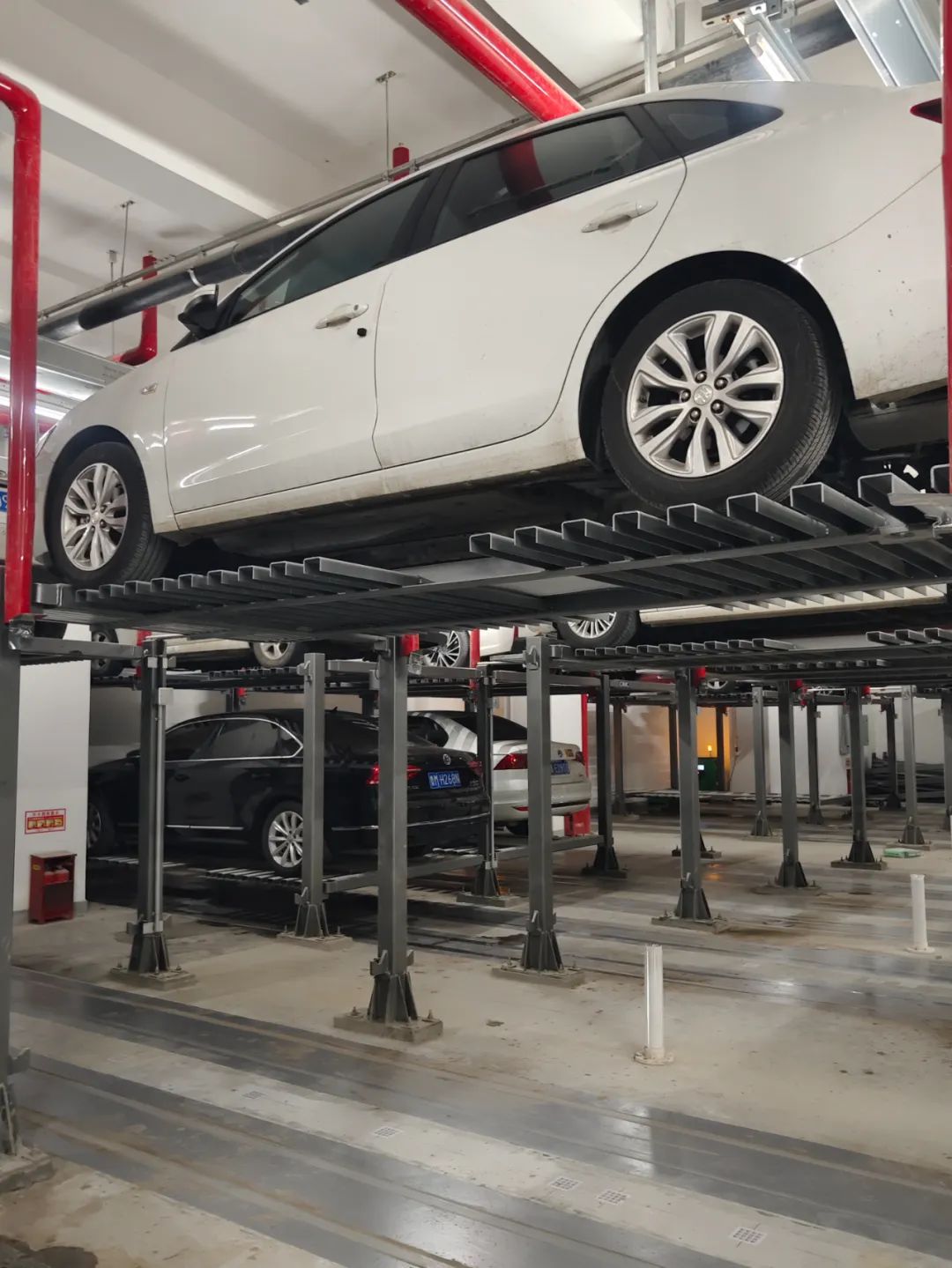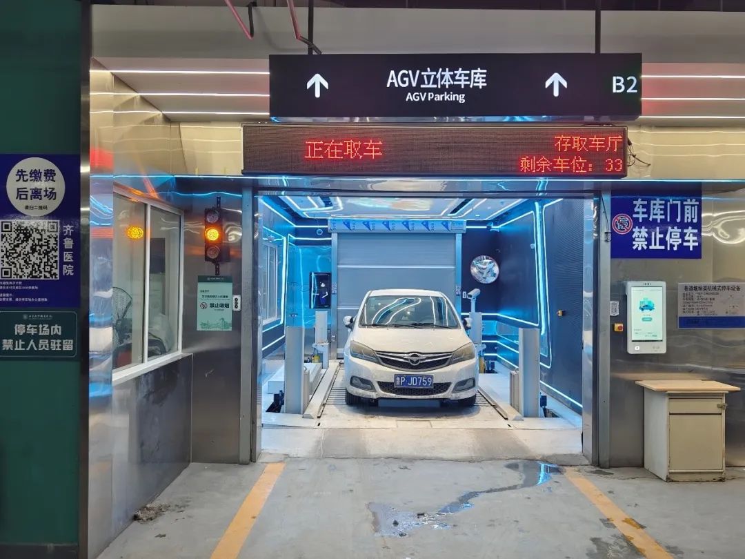 山东大学齐鲁医院急诊综合楼的地下2层和3层停车场共计700多个停车位,机器人智能车库共有2个,位于-2和-3层,共128个机器人车位,采用的是中集智能停车的双层AGV停车机器人系统,该系统不仅车位结构简单,安装、拆除快速,而且故障率低、体验感好,让第一次使用的车主大呼“太有科技感啦”的体验,则是不需要满车场去找车位了,只需要将车辆开进车厅就完成了存车,此时该车的车牌号已通过车牌相机自动抓取进入系统,车主不需要做任何其他操作即可去急诊楼看病或办事,场内AGV机器人会将车辆搬运至车位存放。而车主取车时,只需在终端屏幕上输入自己的车牌号码,场内的AGV机器人就会自动将汽车搬运至车厅,车主直接从车厅将汽车开走即可。