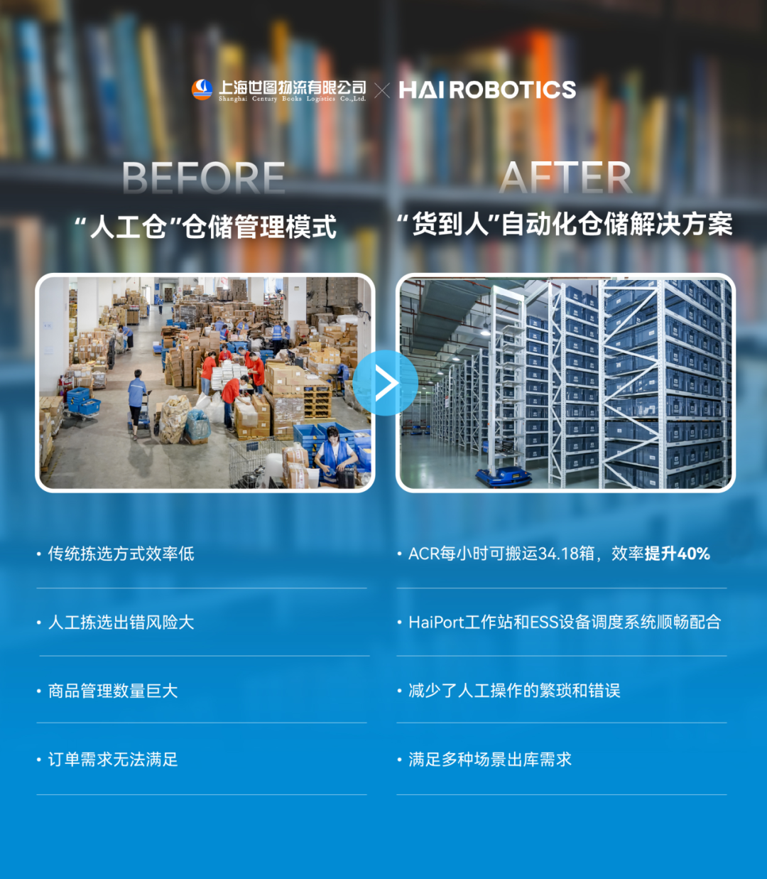 海柔创新为该项目提供软硬件一体化的HaiPick System 1经典货箱到人拣选方案。该方案助力世图物流仓库完成图书的自动化出入库、智能拣选及搬运等业务流程,实现“人找货”到“货到人”的智能升级。