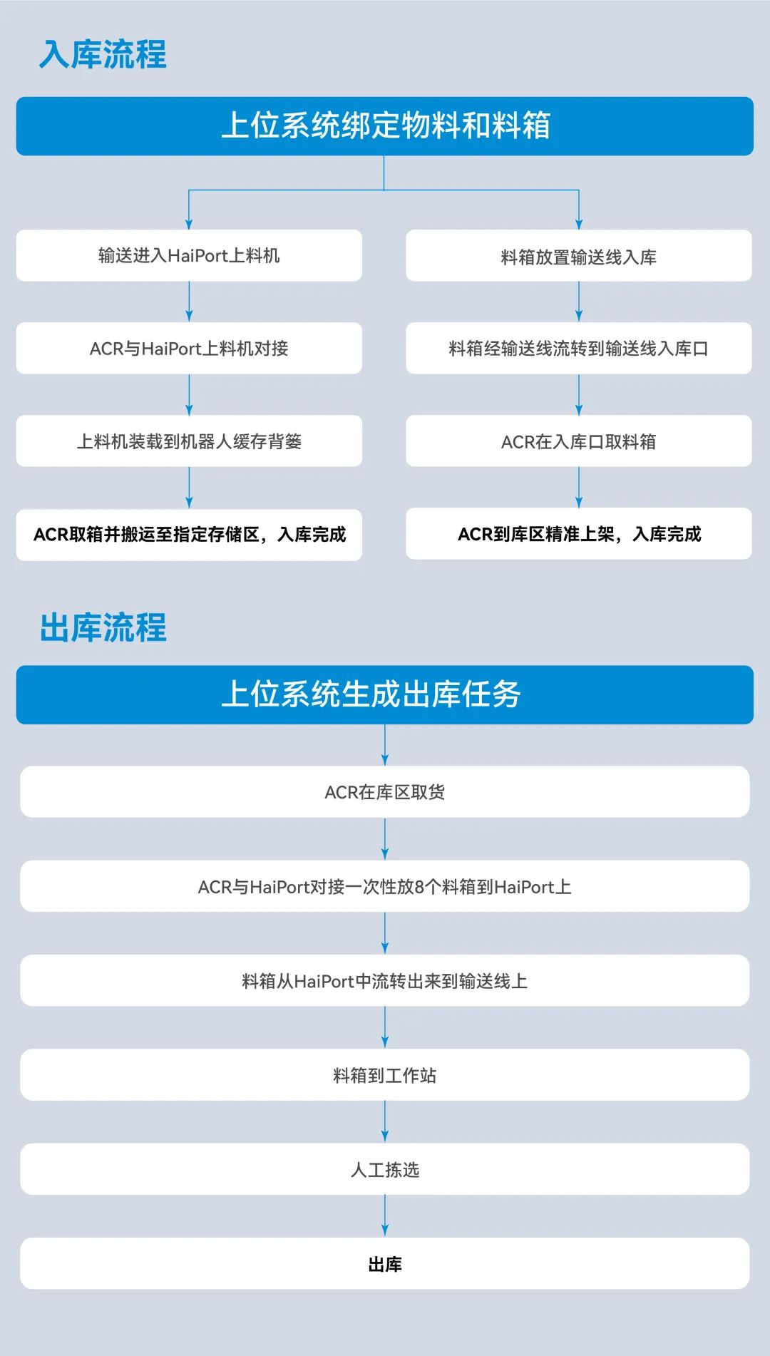 海柔解决方案主要运用在料箱的出入库场景中,搭配HaiPort上、下料机,实现货物高效对接,以满足复杂的作业和管理需求。