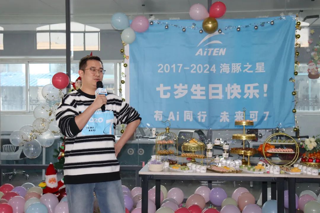 在公司AiTEN的七岁生日会上,海豚先生发表了激情洋溢的演讲,回顾了过去公司取得的成就与面临的挑战,表达了对全体员工不懈努力和奉献精神的深深感激。还特别邀请了来自不同年度的代表人物上台分享,他们不仅是见证者,更是推动公司不断向前的关键力量。