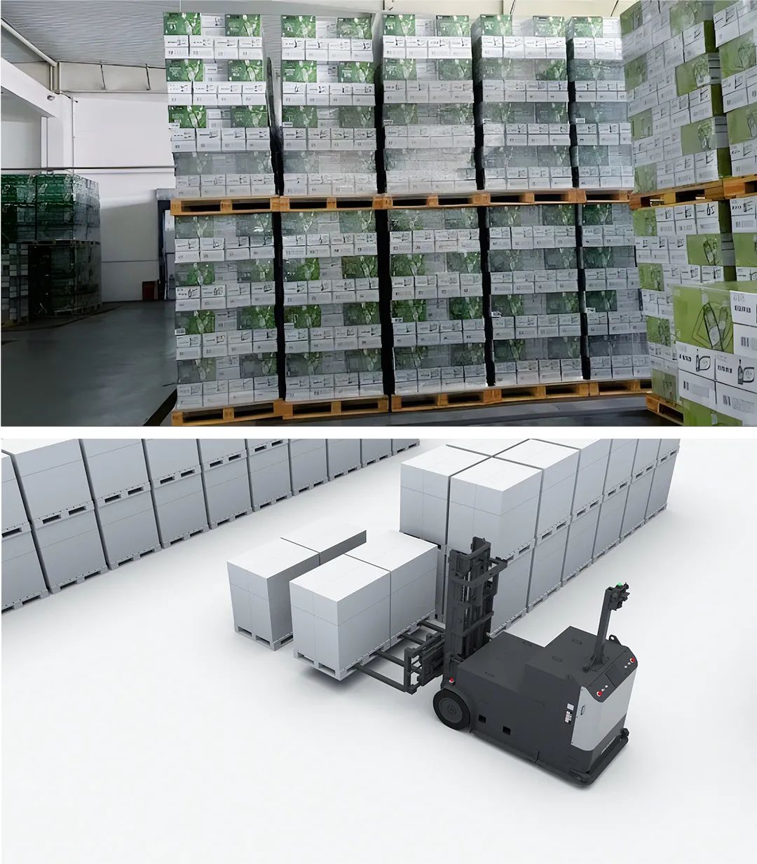 存储方式大多以人工双托堆叠的形式,相比建设立库进行存储,四叉AGV改造代价小,整体成本偏低,存储更灵活。