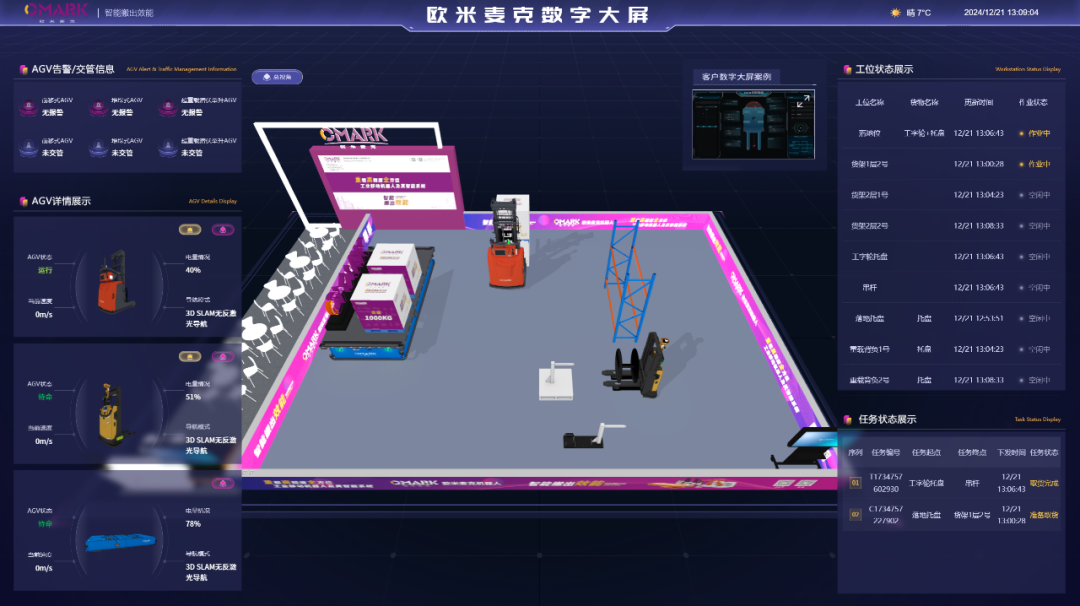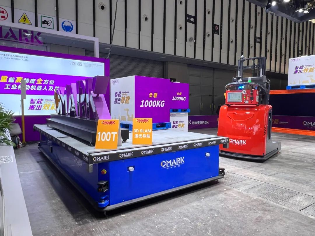 欧米麦克500kg-100T的系列化重载高精度AGV产品,主要用于无人工厂智能化车间内、跨车间、跨厂区的工件/物料自动化运输,同时通过上装实现“最后一米”自动对接上下料的功能,已广泛应用于工程机械、新能源储能、金属冶炼、物流仓储、航空航天等领域,助力企业提升物流和生产效率,降低人力和操作成本,提高作业安全性、正确性,增加生产和物流的灵活性与适应性。本次参展的室外型超级重载AGV,采用自适应悬挂的差速舵轮,实现直行、侧移、原地旋转等平面内360度移动外,可爬坡,可跨越沟槽,导航采用以3D SLAM激光为核心的多传感器融合算法,可适应多变环境,无需任何辅助标记,快速部署,无需施工售后零成本,重复定位精度可达到毫米级,可在室外雨雪天运行。