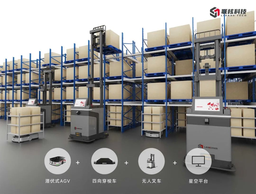 联核无人叉车型号齐全,包括搬运式、堆垛式、平衡重式、全向前式。可满足自动化搬运、配送、堆高、装卸、堆叠等多样化需求,可实现载重0-5吨、举升1-10米、满载2.5米/秒高速行驶,支持个性化需求定制开发。