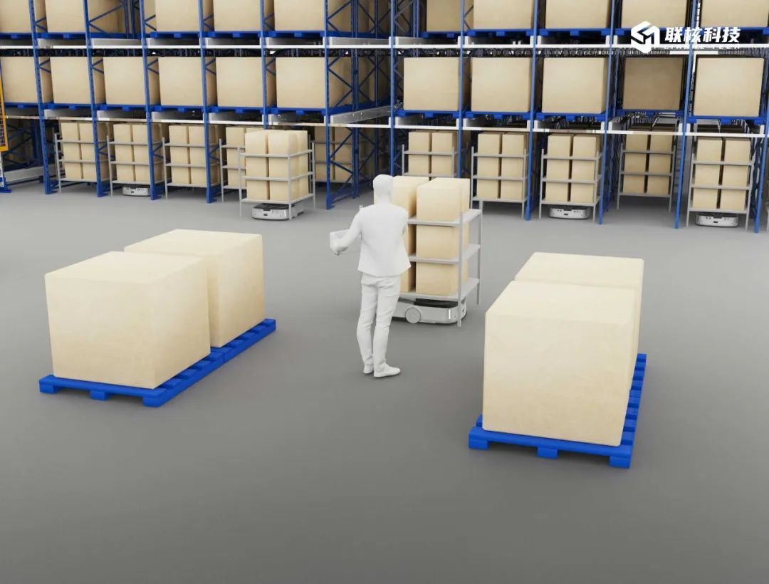 07 潜伏式AGV搬运货物到拣选区,由人工完成补货作业,后台实时更新库存信息。