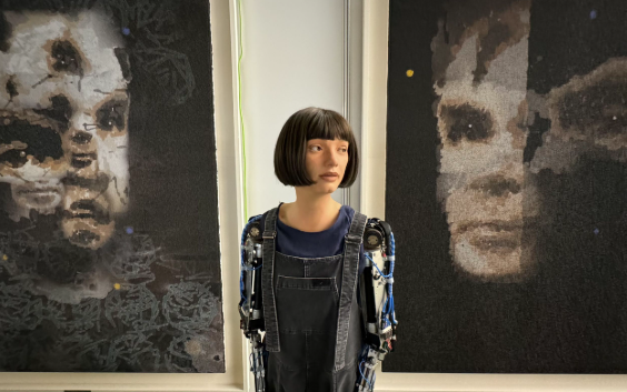 Ai-Da是世界首位超真实的机器人艺术家,由英国画廊老板艾丹·梅勒(Aidan Meller)于2019年与机器人公司Engineered Arts及牛津大学团队合作开发。她的名字致敬了世界首位计算机程序员阿达·洛芙莱斯(Ada Lovelace)。Ai-Da配备了微型摄像头作为“眼睛”,具备面部追踪技术,能够与人进行目光接触,并通过人工智能算法将捕捉到的图像转化为绘画坐标,驱动机械手臂进行创作。此外,她还具备发声能力,能够使用大型语言模型与人交流。