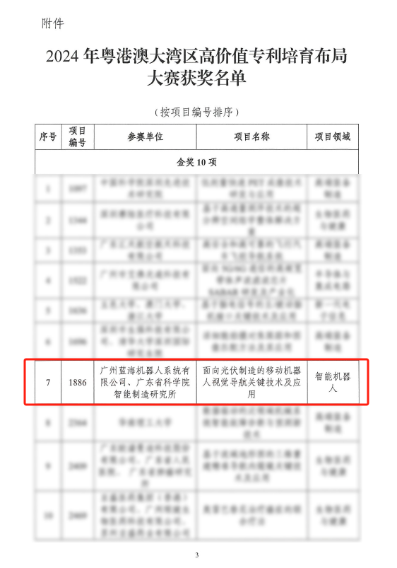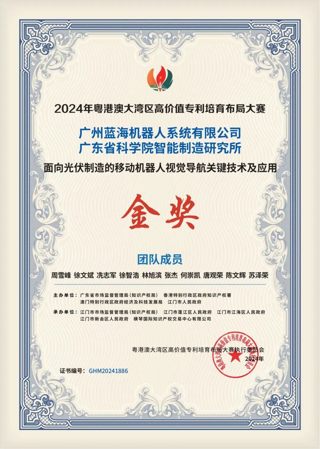 近日,由广东省市场监督管理局(知识产权局)、香港特别行政区政府知识产权署、澳门特别行政区政府经济及科技发展局和江门市人民政府共同主办的2024年粤港澳大湾区高价值专利培育布局大赛(以下简称“湾高赛”)获奖项目名单公布,由广州蓝海机器人系统有限公司、广东省科学院智能制造研究所联合开发的《面向光伏制造的移动机器人视觉导航关键技术及应用》项目从1600余个海内外报名的科技创新项目中脱颖而出,斩获金奖。