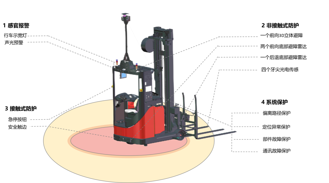 采用多激光以及光电等电器使得AGV在运行以及工作时能够及时自主检测附近相关障碍物,并能精确取放货物,在调试环节的多方位急停按钮设置能够在最大程度上保障AGV相关负责人的安全;
