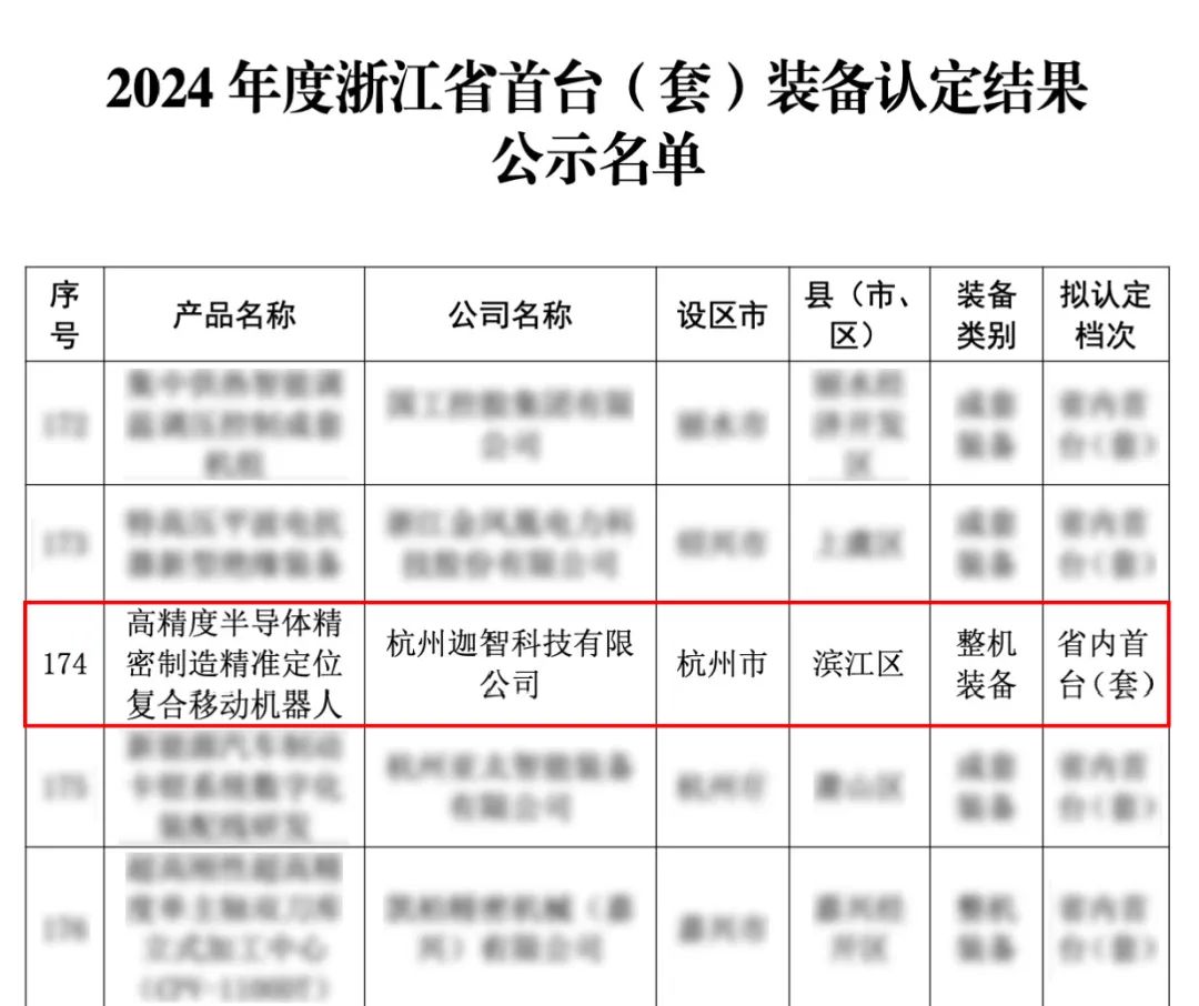 近日,迦智科技高精度半导体精密制造精准定位复合移动机器人,经过严格评审,被认定为2024年度浙江省首台(套)装备。