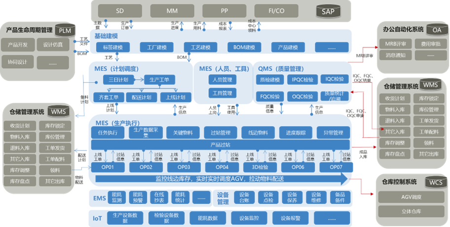 项目开发的MOM平台集成了MOM、QMS、EAM、EMS等自动化生产与运营功能,并预留统一数据接口,支持现有和正在建设的PLM、SCADA、WMS等系统集成,实现生产排程、过程管控、产品质量管理、设备维护、能源监控等的智能化,辅助企业决策,具体实施方案如图所示。