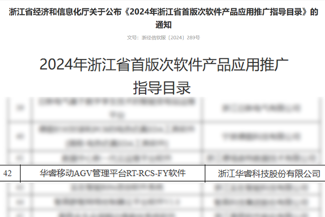 近日,省经信厅公布《2024年浙江省首版次软件产品应用推广指导目录》,华睿科技移动AGV管理平台RT-RCS-FY软件光荣在列!