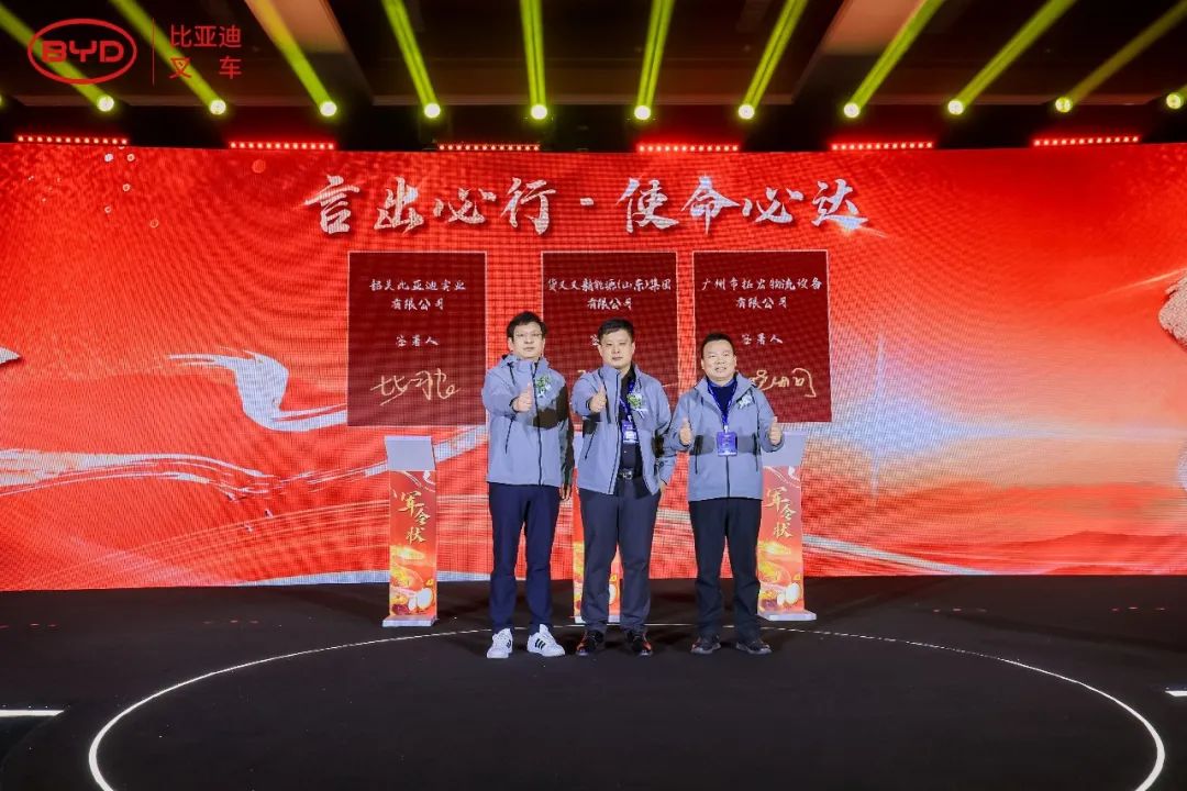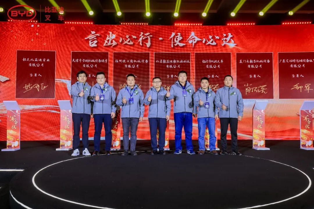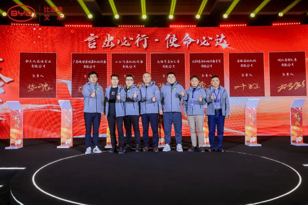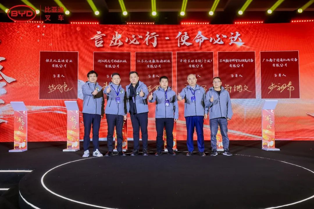 2025年已拉开序幕,在全体与会人员的见证下,毕总与多位经销商代表共同签订了新一年的销售目标,更加坚定了大家齐心共赢的信念,也预示着比亚迪叉车2025年定将跃启新篇。