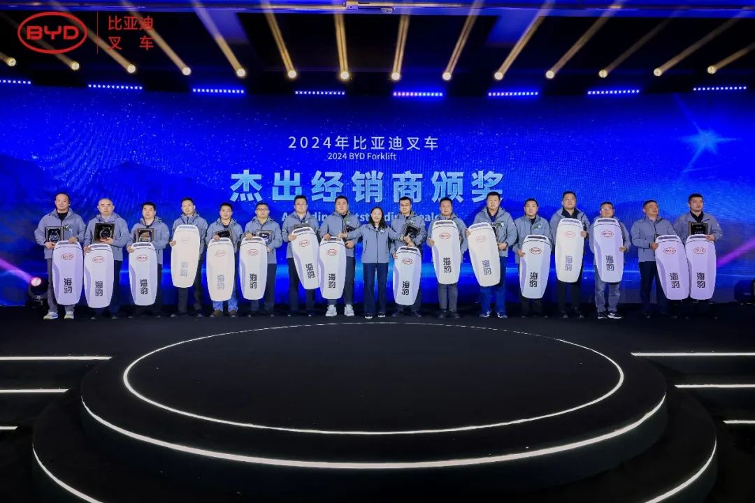 大会同时颁发了飞跃成长奖、卓越经销商奖、以及杰出经销商奖,并对在2024年销售业绩表现突出的优秀经销商进行了奖励,以感谢他们对比亚迪叉车发展做出的贡献。