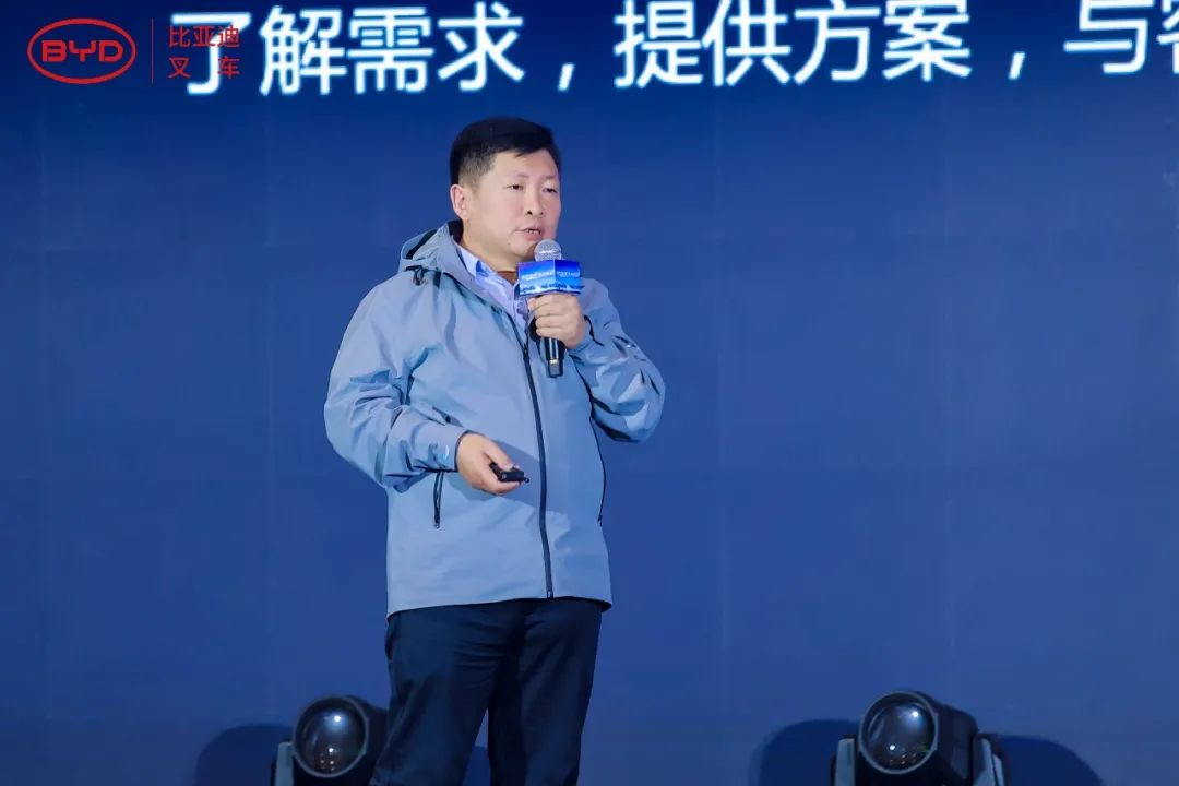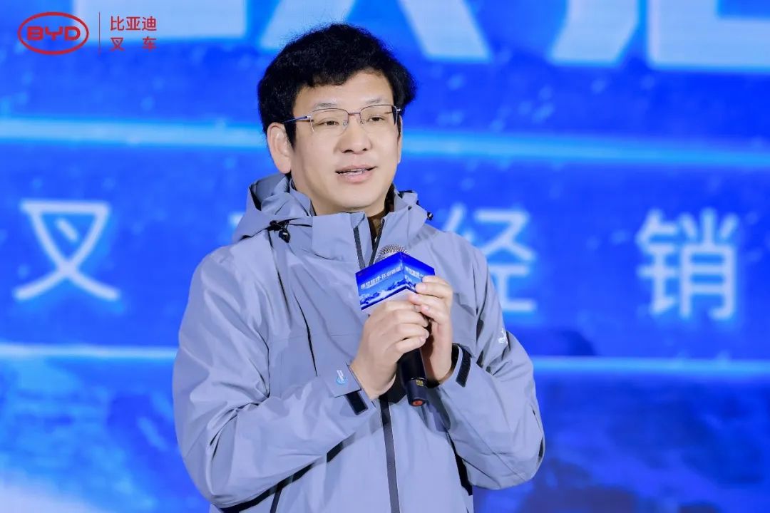接下来,由比亚迪叉车总经理毕国忠先生致辞,毕总首先对在座嘉宾的莅临表示感谢。毕总表示,2024年比亚迪叉车排除万难、逆风而行,在新的发展时期,克服内外部不利因素,获得了稳健增长与骄人业绩,而实现这一目标离不开精准的产品布局和有效的市场策略。针对当前行业的发展,毕总表示全球正进入能源变革时代,绿色、低碳、高效的发展已成为主旋律,而清洁的物流搬运设备作为改善能源结构的重要一环,使得叉车行业“油改电”成为大势所趋。作为一家自主研发锂电叉车的企业,比亚迪叉车将继续坚持自主创新、不断提升产品价值,为叉车行业的绿色变革贡献力量。