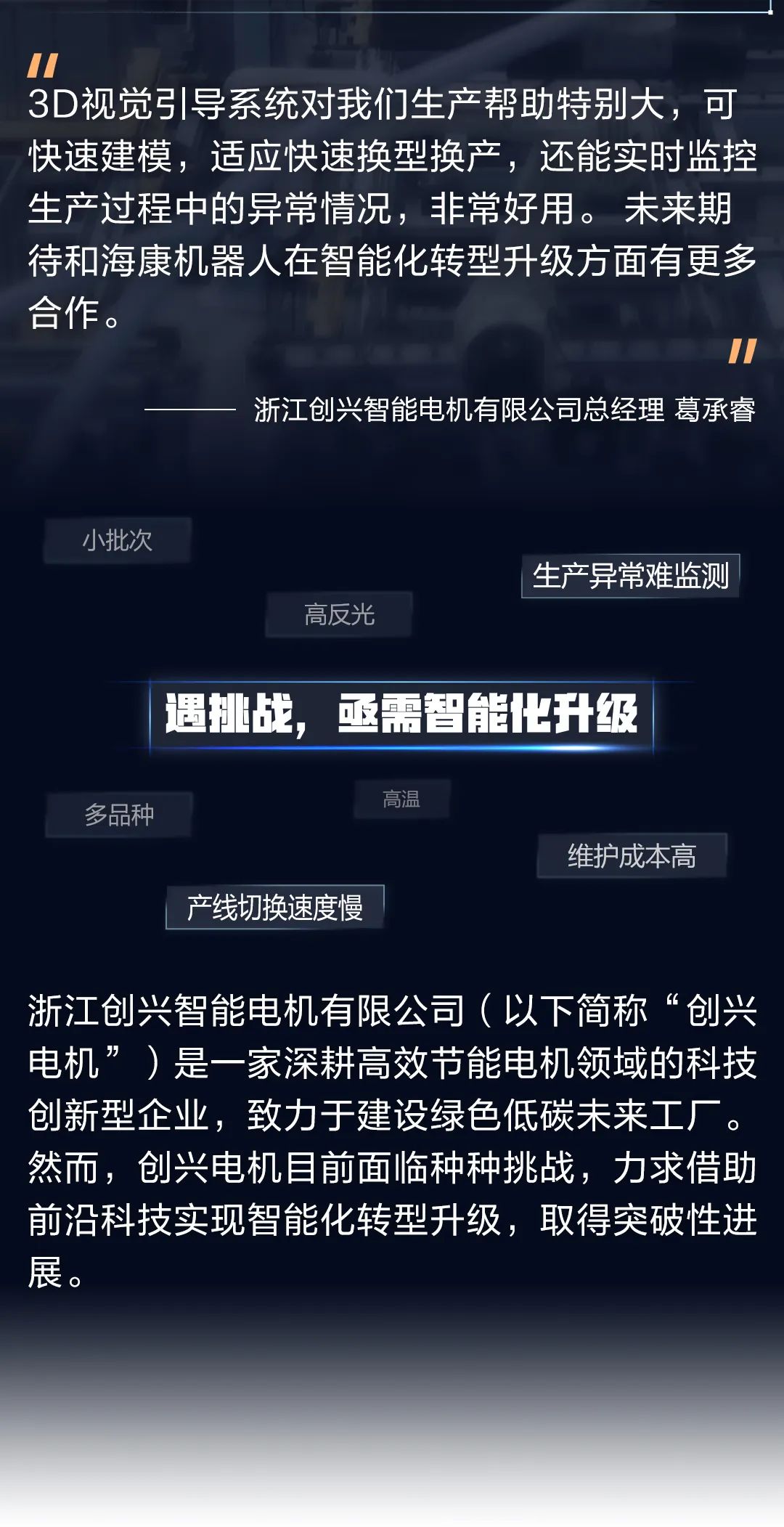 创兴电机从需求匹配、生产效率、异常监测、数字化管理、建设成本等多个维度考虑,最终选择与海康机器人携手,以工业4.0为标准打造未来工厂。