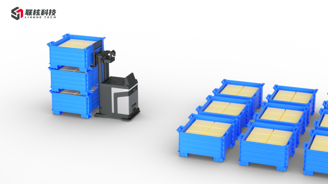 联核无人叉车通过激光雷达识别技术,对料笼进行精准识别。能够准确识别笼箱的形状与轮廓等特征,确保对接的准确性。能够识别不同大小、尺寸、规格的料笼,满足多样化的搬运需求。联核科技无人叉车料笼堆叠技术极大地节省了仓库的垂直空间,使得有限的仓储区域内可以存放更多货物。