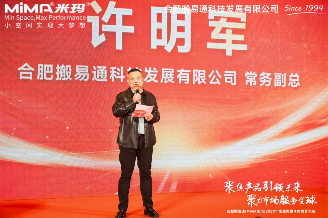 欢快的序曲奏响,热烈的掌声雷动,年会正式拉开序幕。合肥搬易通(MiMA米玛)常务副总许明军走上舞台,进行2024年度总结及开幕致辞。在致辞中,他代表公司向全体员工致以最真挚的新春问候与美好祝愿,并对过去一年中每位员工的辛勤工作与不懈奋斗表达了深切感谢。