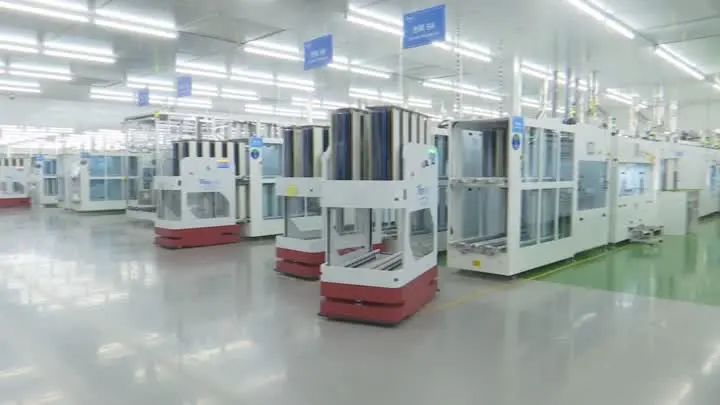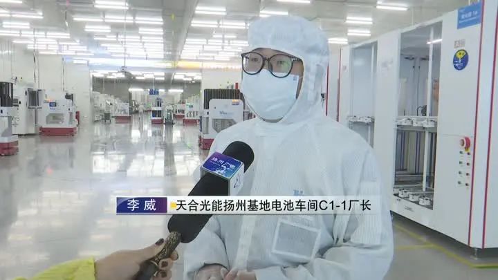 在天合光能扬州基地的TOPcon电池生产车间,一台台智能设备高速运转,AGV小车来回穿梭运送物料,工人们穿着无尘服操作生产线,卡控每一道工序的生产质量,整个车间一派忙碌场景。