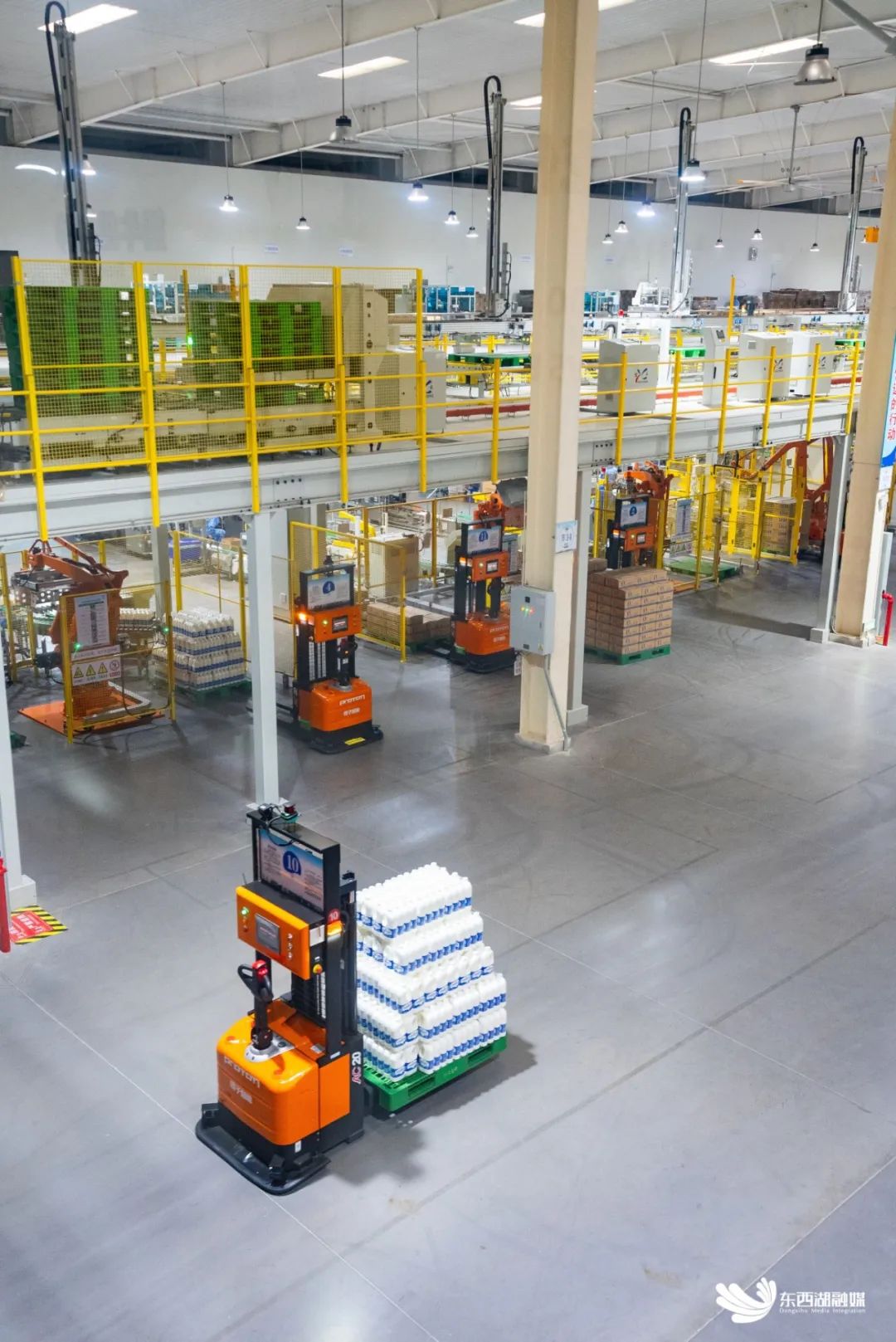 公司自研的机联网系统,能够实现机器间的“无障碍沟通”。码垛机器人在完成80%货品堆放时,会向系统发出指令,AGV运输小车得到指令后立即出发,提前到达指定位置,将货物运送到指定仓库,这时会“从天而降”一块绿色栈板,无缝衔接继续承载货品,保证包装产线的连续性生产。2024年,武汉光明技改项目被评为市智能化改造示范项目。