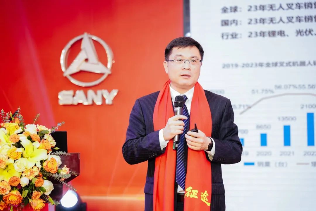 在此次大会上,三一集团高级副总经理、三一机器人董事长徐鹏飞对与会的广大合作伙伴表示了热烈的欢迎和衷心的感谢。他指出,在过去一年,三一机器人的经营能力整体稳健,三一叉车凭借卓越的性能和可靠的品质,赢得了众多终端用户和细分市场的认可与信赖。徐鹏飞表示,这一成就的取得离不开经销商和供应商伙伴的大力支持和帮助。