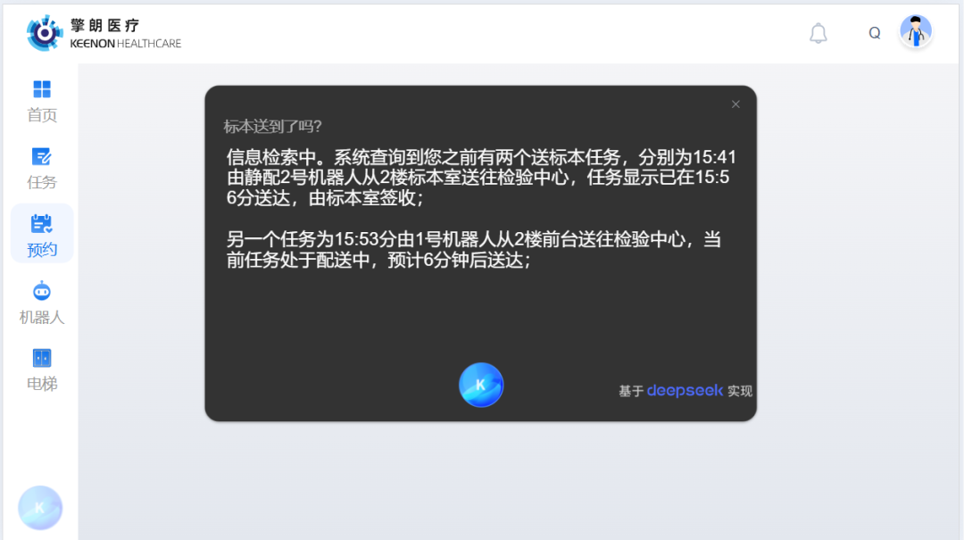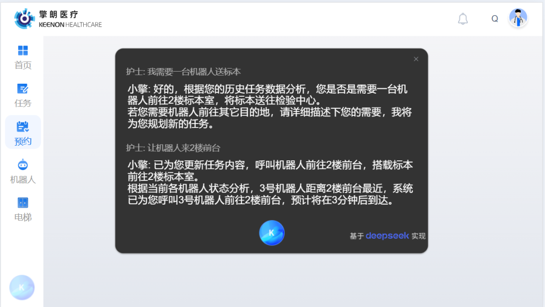 机器人在使用过程中,医务人员会需要查询医疗物资配送状态、预期到达时间、历史配送情况和机器人健康状态等信息,擎朗医疗建立了医疗场景专属的机器人运行数据库,通过深度学习实现知识萃取,用户查询响应时间和准确度大幅提升。此外,在面对复杂故障时,将启动“三方会诊”模式:AI客服、现场工程师、擎朗远程专家同步接入,系统自动生成包含设备参数、错误日志的会诊报告。