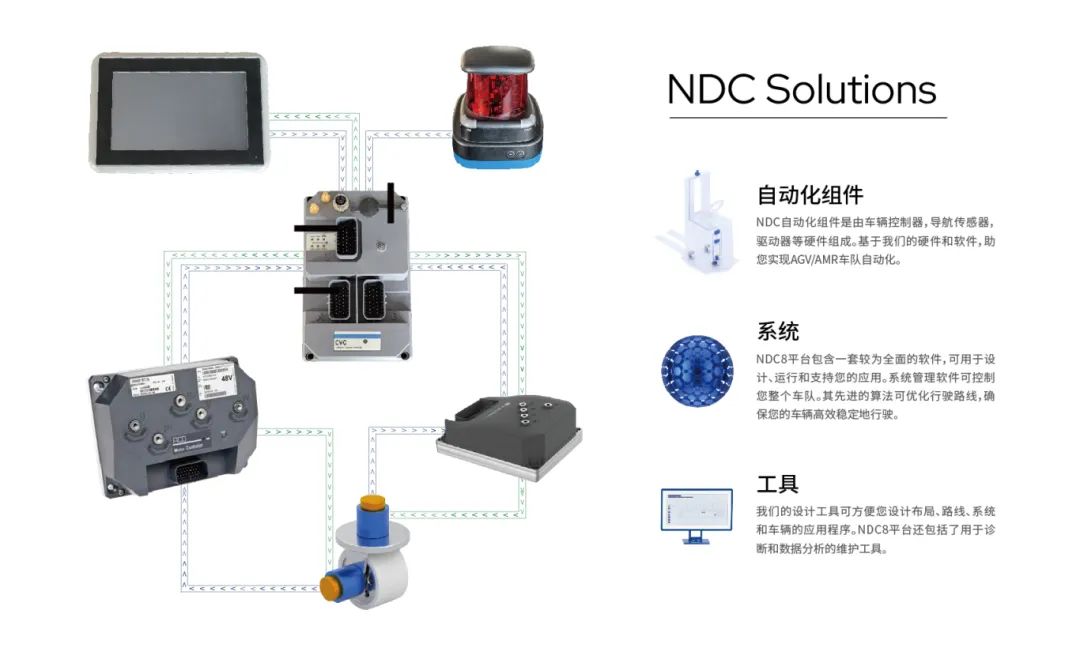 科尔摩根AMS的NDC解决方案是由车辆自动化组件、系统软件和设计与扫描工具组成。NDC 8平台包括用于管理车队和有效引导车辆的软件,以及用于导航和控制的硬件。