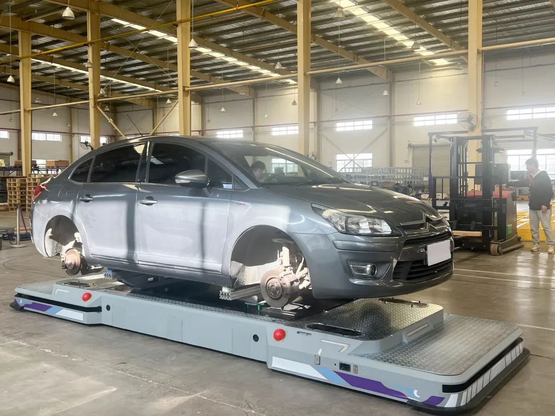 ▲法睿兰达自主研发的“鲲鹏”系列主线移动机器人,可搭载整个汽车车身在车间自由行驶。