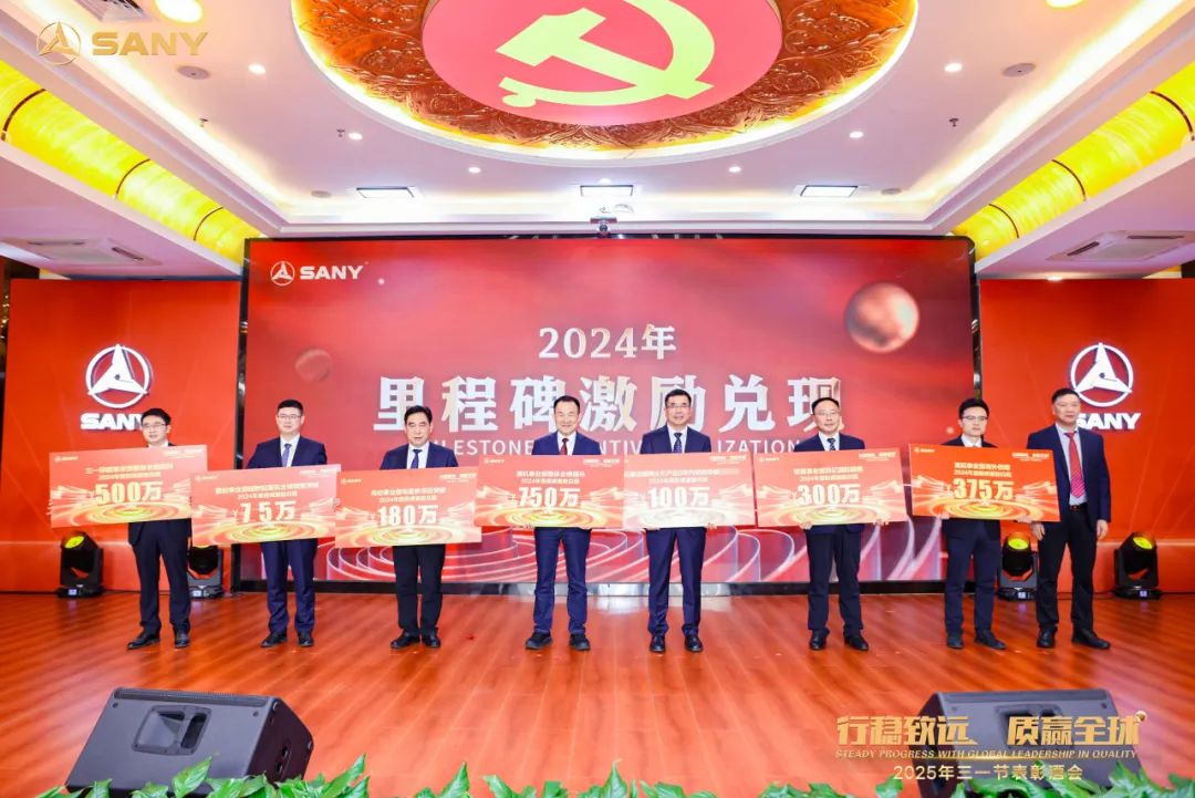 此前,三一集团共设立27个里程碑激励。令人振奋的是,其中8个于2024年成功达成阶段目标。为此,本次三一节表彰酒会特别设置“里程碑激励兑现”颁奖,兑现激励总额高达2400万元。
